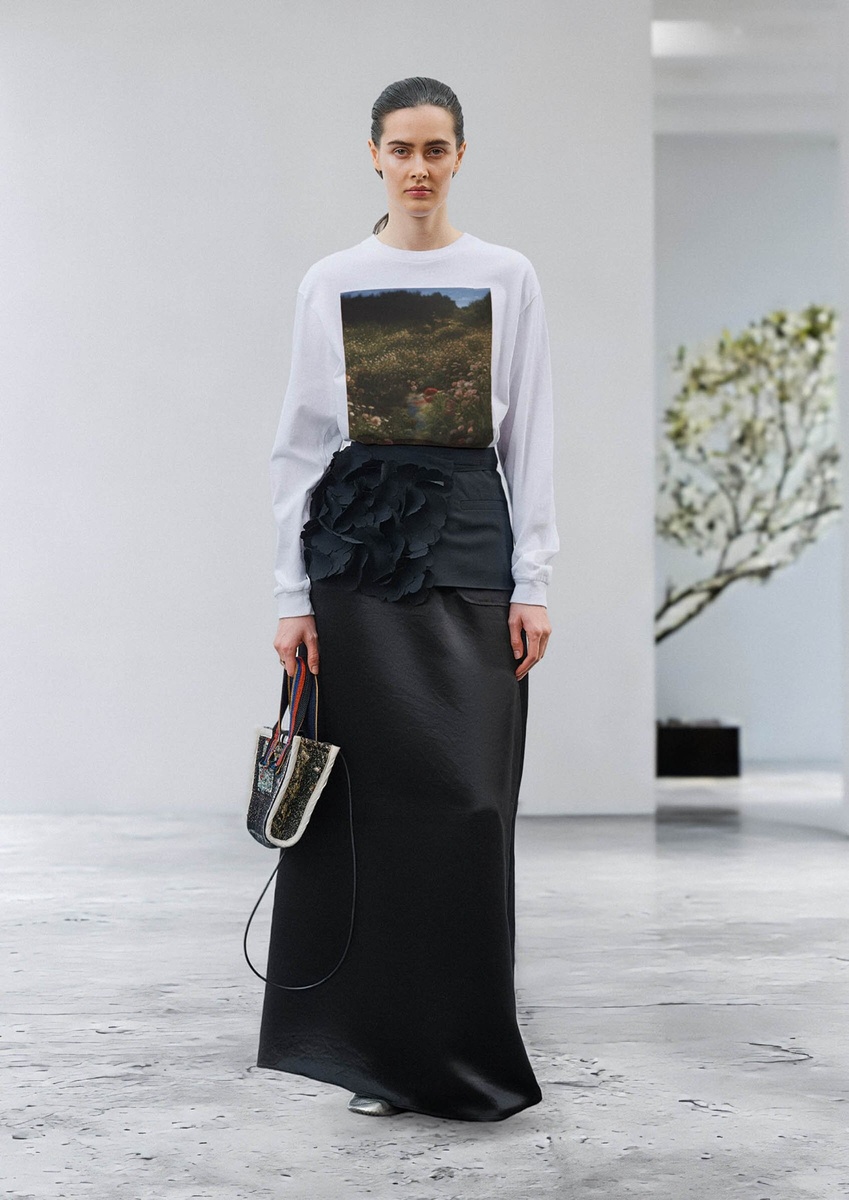 Бренд PONTI — японская марка дизайнера Нобуэ Хираты. Само название отсылает к ponchi-e, то есть к рисунку-эскизу, где идея строится через форму, структуру и намек. И это очень чувствуется в лукбуке осень–зима 2026/2027: коллекция не кричит, а собирает образ через пропорции, фактуры и точные детали. Ponti делает ставку на тихую выразительность. Свободные брюки, мягкий трикотаж, расслабленные костюмы, длинные юбки, жилеты, простые рубашки и платья-комбинации здесь работают не по отдельности, а в сочетаниях. Один образ держится на слоистости, другой — на цвете, третий — на контрасте между утилитарностью и мягкостью. Особенно хорошо читается настроение коллекции: она не про показную эффектность, а про современный гардероб с характером. Серо-синие, молочные, шоколадные и черные тона выглядят очень спокойно, а редкие акценты красного и принта не ломают общую идею, а оживляют ее. За счет этого лукбук смотрится цельно и дорого. Главная тема коллекции, по ощущениям, — комфортная интеллектуально