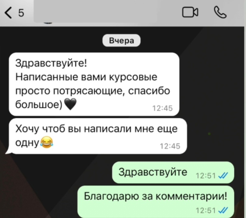 Когда вам нравится что-то - вы наверняка попросите добавку. Будь то вкусное блюдо, качественный кофе, умелый массаж, крутая стрижка. Вы снова придете туда, где вам сделали все на высшем уровне. Так и у моих клиентов. Аппетит на заказ новых работ просыпается после того, как они получают первый результат. Клиент из этого кейса заказывал курсовые. Все были довольно срочные. Главное требование: сдать в срок + отработать содержание так, чтобы даже самый требовательный научный руководитель принял без вопросов. 😎 Подобрал отличные источники, с нуля выстроил структуру, написал. Сдал. ✅ 😉 Приняли с первого раза без правок! Клиент дал вот такой замечательный фидбек с запросом на ещё одну работу. Разве я могу отказать? Рад вашему доверию и успехам! ‼️ Хотите уникальную курсовую или диплом, которые пройдут все проверки? Тогда вам сюда => НАПИСАТЬ МНЕ В ВК или написать в Telegram @volgapkinStud МОЙ КАНАЛ В TELEGRAM СООБЩЕСТВО В ВК ОТЗЫВЫ О МОЕЙ РАБОТЕ