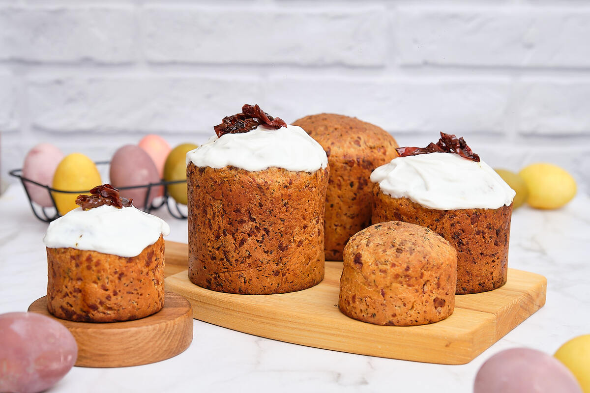 Пасхальный кулич можно приготовить и несладким, добавляем колбасу, сыр, вяленые томаты и делаем шапочку из крем-чиза или сыра со сметаной, украшаем кусочками вяленых помидоров, зеленью. И у нас получается вкусная выпечка в пасхальном виде.