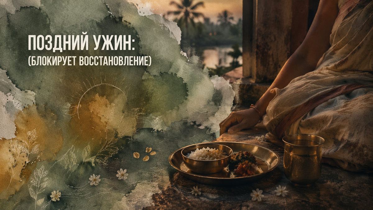 Есть вещи, которые тело делает каждую ночь без вашего участия. Оно чистит. Сортирует. Восстанавливается. Это не метафора — это физиология, которую аюрведа описала несколько тысяч лет назад, а современная наука только начинает подтверждать. Проблема в том, что большинство людей этот процесс блокируют. Каждый вечер. Не специально. Просто не зная. С примерно 22:00 до 2:00 ночи тело переходит в режим восстановления. Пита-время — в аюрведе это период, когда внутренний огонь направлен не на переваривание пищи, а на переработку всего накопленного за день. Клеточное обновление, работа с остатками, восстановление тканей. Если желудок в этот момент занят едой — процесс останавливается. Тело переключается обратно на пищеварение и чистку откладывает. Вот что блокирует ночной детокс чаще всего. Поздний ужин Еда после 19:00-20:00 — и тело до полуночи занято желудком, а не восстановлением. Это не страшно раз в неделю. Но когда так каждый день, годами — накапливается то, что в аюрведе называют ама: не