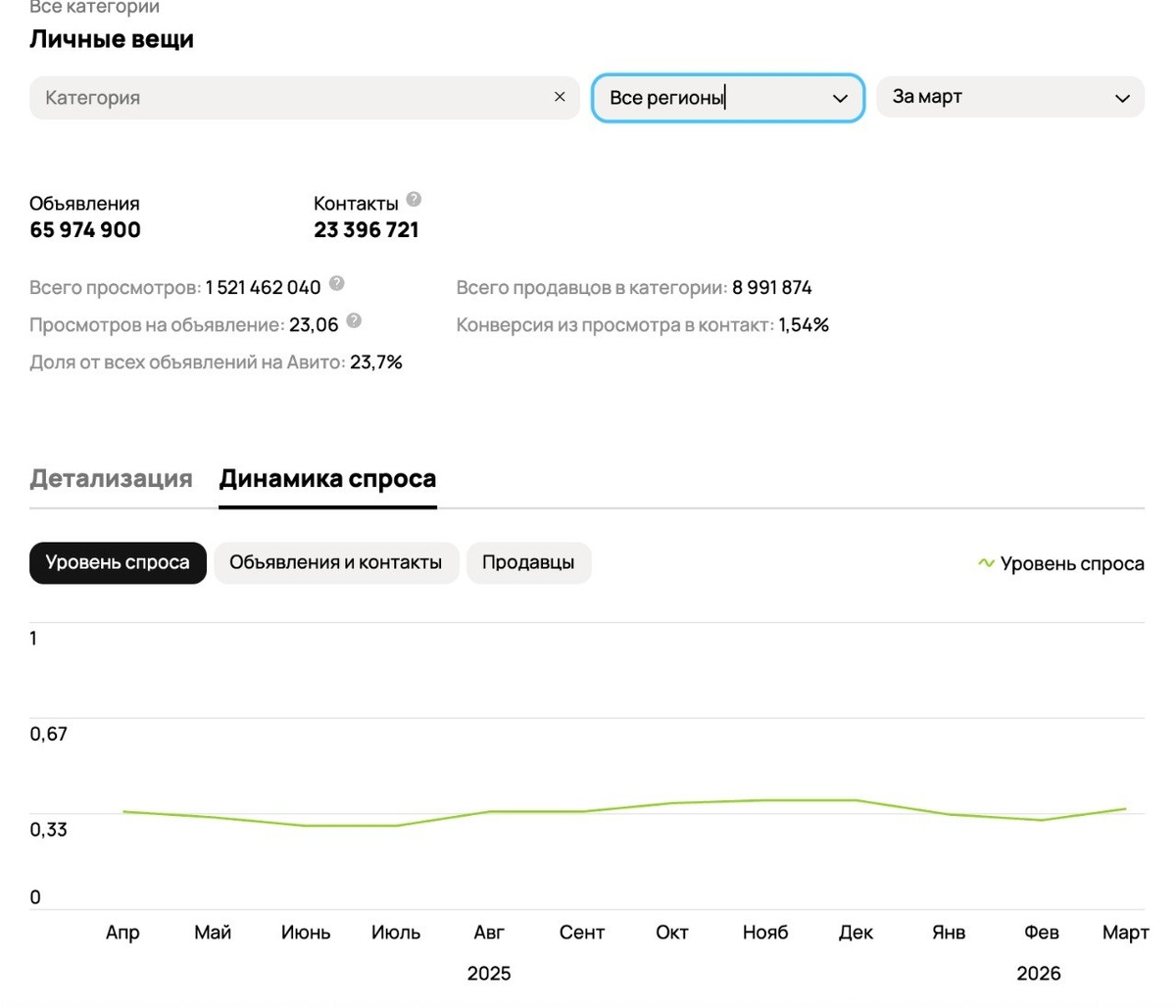 Здесь на графике видим, что общий спрос в Личных вещах в марте заметно подрос, по сравнению с февралем. Сейчас спрос почти на пике значений графика за целый год. Это приятная новость, хотя по своим объявлениям такого не наблюдала: февраль торговался очень активно, март - заметно хуже. Но мои продажи - лишь частный случай.