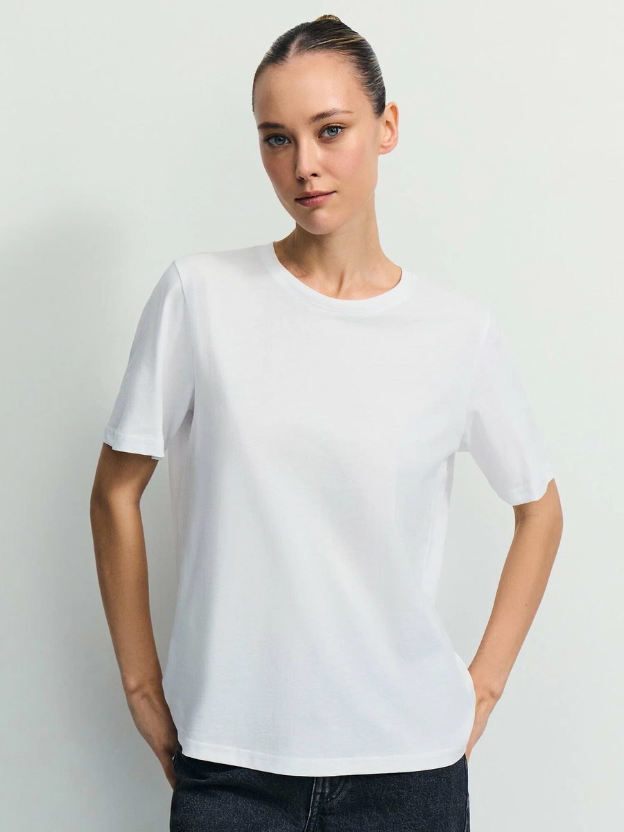 Белая футболка - это как хороший тон: заметен только когда его нет. Здесь редкость в том, что плечо на месте, посадка не превращает вас в вешалку, и при этом чистый хлопок. В любом возрасте такая футболка - основа под жакеты, кардиганы, тренчи и даже под нарядные юбки.