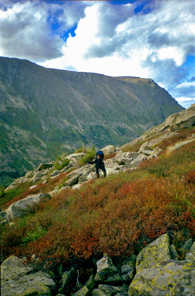 Подъём по камням периодически сменялся подъёмом по берёзке. Так длилось до первого видимого гребня. После этого гребня наши мучения продолжились. Снова камни, трава и березка, но, на этот раз, более мелкая, чем внизу. И так до следующего гребня. После него начался подъём по траве, лишь изредка перемешивающийся с берёзкой, совсем уж карликовой.