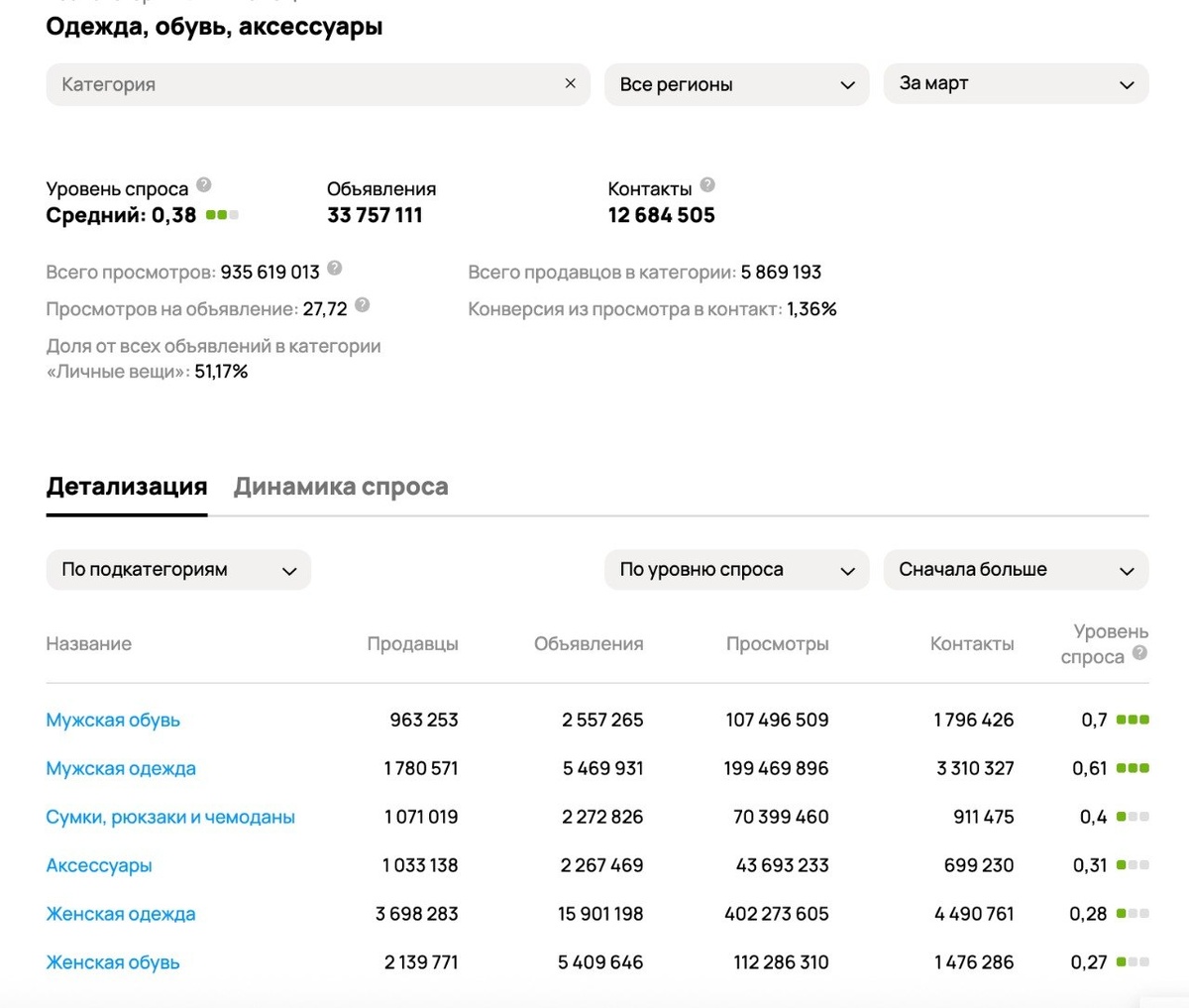 Не самая торгуемая, но самая многочисленная по объявлениям подкатегория Одежда, обувь, аксессуары изнутри выглядит стабильно довольно давно: мужская обувь и одежда в лидерах, а женская одежда и обувь - в аутсайдерах.