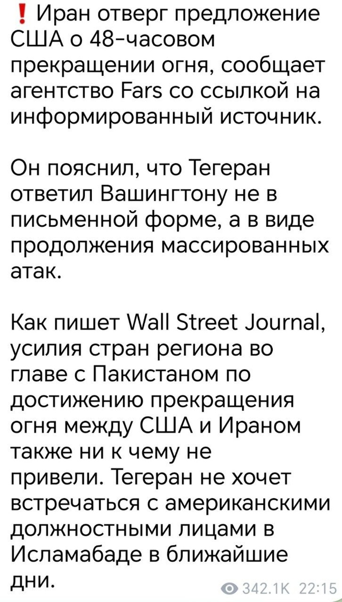 ! Дьявол всегда обманет. Никаких перемирий! А какие-либо обсуждения - без остановки боевых действий. Если США и/или Израиль предлагает (читай - "просит") перемирие (под любым предлогом!), это означает, что им нужна пауза для переброски живой силы и технических средств, а также для перегруппировки. ❗️ Ну, а Россия должна оказать (продолжать оказывать) Ирану помощь как своему союзнику в регионе. И, да - можно уже делать это открыто. Все "красные линии" давно позади!