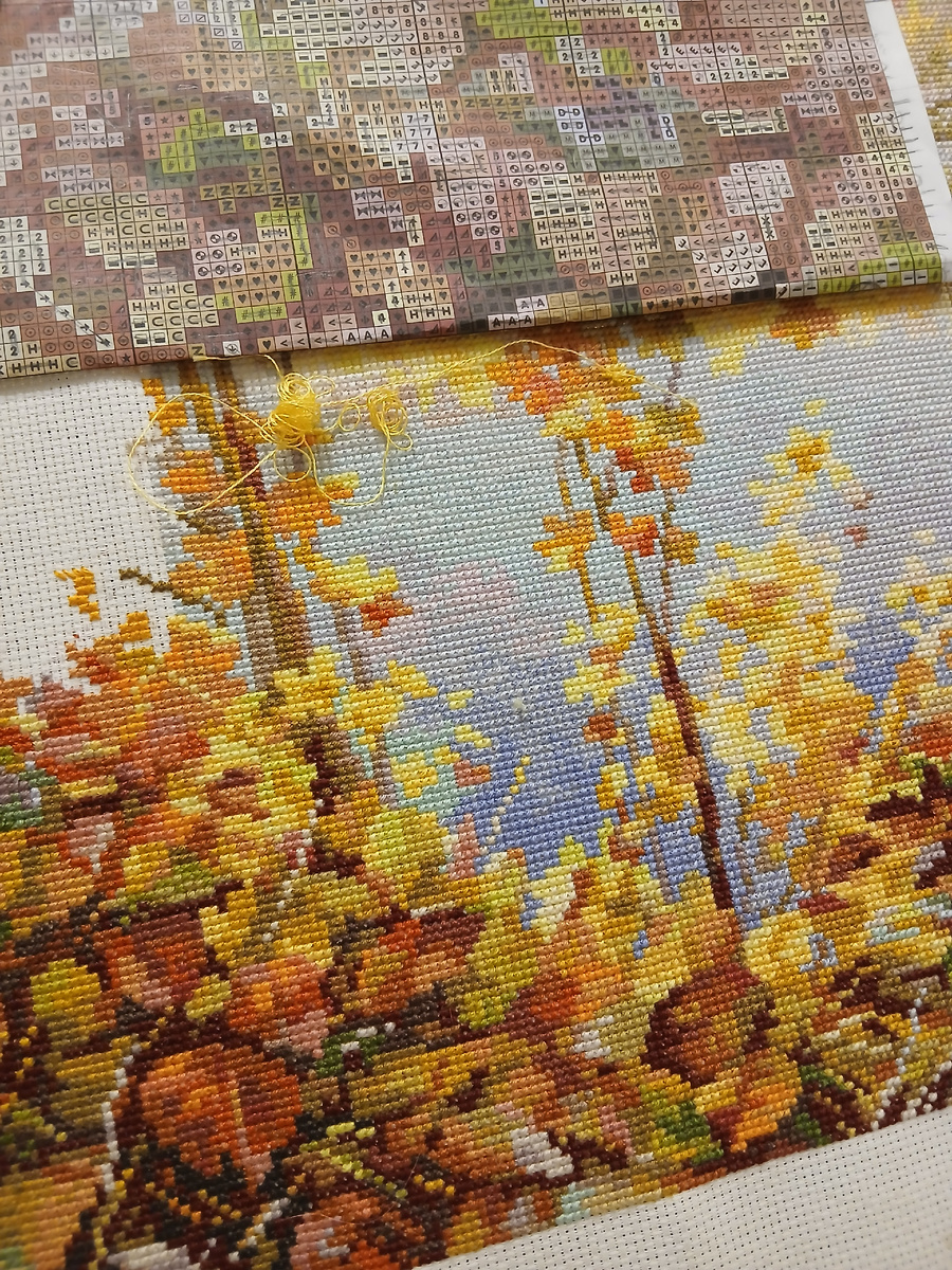 Сегодня представляю очередной отчет о продвижении вышивального процесса "Дивная осень" от Панна. Весь последний месяц с последнего отчета этот процесс оставался основным, а точнее единственным вышивальным процессом над которым я работала. Где-то в глубине души я очень надеялась представить сегодня отшив всех крестиков, и в следующий месяц перейти с доработкой по бэкстичу и оформлению. Вышивая почти ежедневно мне почти удалось это. Посмотрите какой небольшой участок остался незашитым. Когда вышивка переходит границу в 75% продвижение любого масштаба становится очень заметным и это значительно повышает скорость работы. И вот теперь когда я рассказываю о близком завершении этого процесса вдруг пришло осознание, что мне предстоит с ним расстаться. Конечно, оформленная работа займет свое место в интерьере, и видеть я ее буду почти постоянно. Говоря о расставании я имею ввиду расставание с самой деятельностью: с тем как был организован процесс, как я искала наиболее удобное положение рамы д