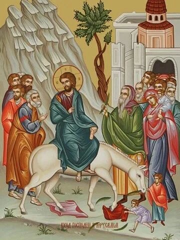 Его встречают как царя Израиля: ликующая толпа, пальмовые ветви, возгласы: «Осанна Сыну Давидову! благословен Грядущий во имя Господне!». Вот Он — Тот, о Ком предсказывал пророк Захария за 400 лет до этого дня: «Се, Царь твой грядёт к тебе, праведный и спасающий, кроткий, сидящий на ослице».