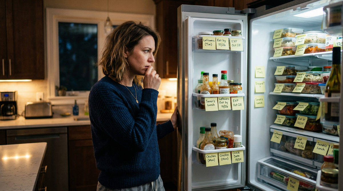 Он принялся раскладывать провизию по холодильнику. Марина молча наблюдала, как он достаёт из пакета рулон жёлтых стикеров и аккуратно подписывает каждый контейнер. Почерк был его, но слова — мамины.
