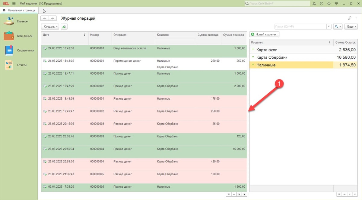 … Решили мы тут с сыном посмотреть новый интерфейс 1С:Предприятие 8.5, которые позиционируется как «воздушный». Для ознакомления взяли небольшую, полностью самописную конфигурацию, которую он в прошлом году написал в качестве школьного проекта. Конфигурация для учета домашних финансов и проста как мычание: приход, расход, перемещение, учет по кошелькам и статьям расходов/доходов. Никаких сложных форм, все очень просто, что тут может пойти не так? Для конвертации форм мы воспользовались встроенным инструментом в разделе Рефакторинг, который много чего исправил и оптимизировал. При этом мы надеялись, что официальный инструмент покажет нам как правильно, как это задумано самой 1С. На первом скриншоте показано как было. Основная страница представляла собой журнал операций и список кошельков с балансом в каждом из них, между частями формы есть видимая граница, которую мы можем перемещать, например, сделав журнал по шире. Табличная часть журнала при этом автоматом масштабируется, но даж
