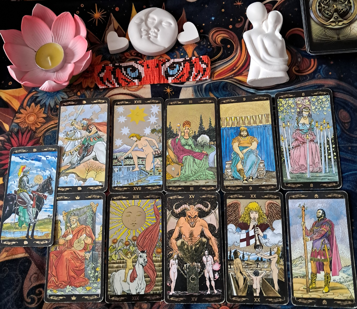 Ваш путь к себе — это эпическое путешествие, где уже были и бури, и звёзды. Карты говорят, что самое интересное впереди. Вы прошли точку невозврата, и теперь Вселенная ведёт вас к целостности через несколько мощных этапов. Итоговый Рыцарь Пентаклей обещает: финал будет не вспышкой, а устойчивым, твёрдым состоянием «я дома в своём теле и жизни».