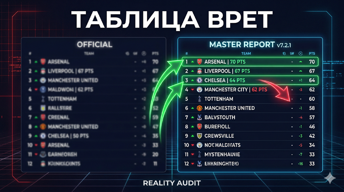 Математика говорит: «Вы сильнее». Мы прогнали каждый матч сезона через аудит модели Master Report v7.2.1. Результат ломает привычную картину мира. Реальная таблица АПЛ прямо сейчас выглядит так: Это не мнение. Это цифры.