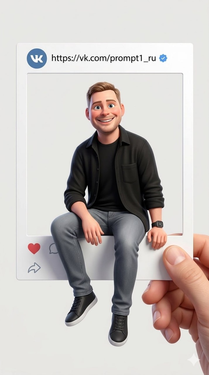 У нас кстати есть группа VK Изобрази мужчину в полный рост выглядывающую из рамки поста в Vkontakte, как будто он персонаж соцсетей. Он сидит на нижней перекладине рамки, спустив ноги вниз. Он одета также, как и в предоставленном фото (лицо, одежда, прическа, аксессуары). Фон нейтральный. Мужчина радостный, милый, с широкой улыбкой. В рамке указано имя профиля [@свой]. Добавь иконки лайк, комментарии и отправить в стиле Млщтефлеу. Рамку держит рука. Формат 9:16 Стиль:pixar most-AI.com - 80+ популярных нейросетей в одном приложении без VPN. Лучшие цены! 75% кэшбэка на бонусный баланс по промокоду PROMPT1RU_75 Еще у нас есть сайт https://prompt1.ru/ #smm@prompt1_ru