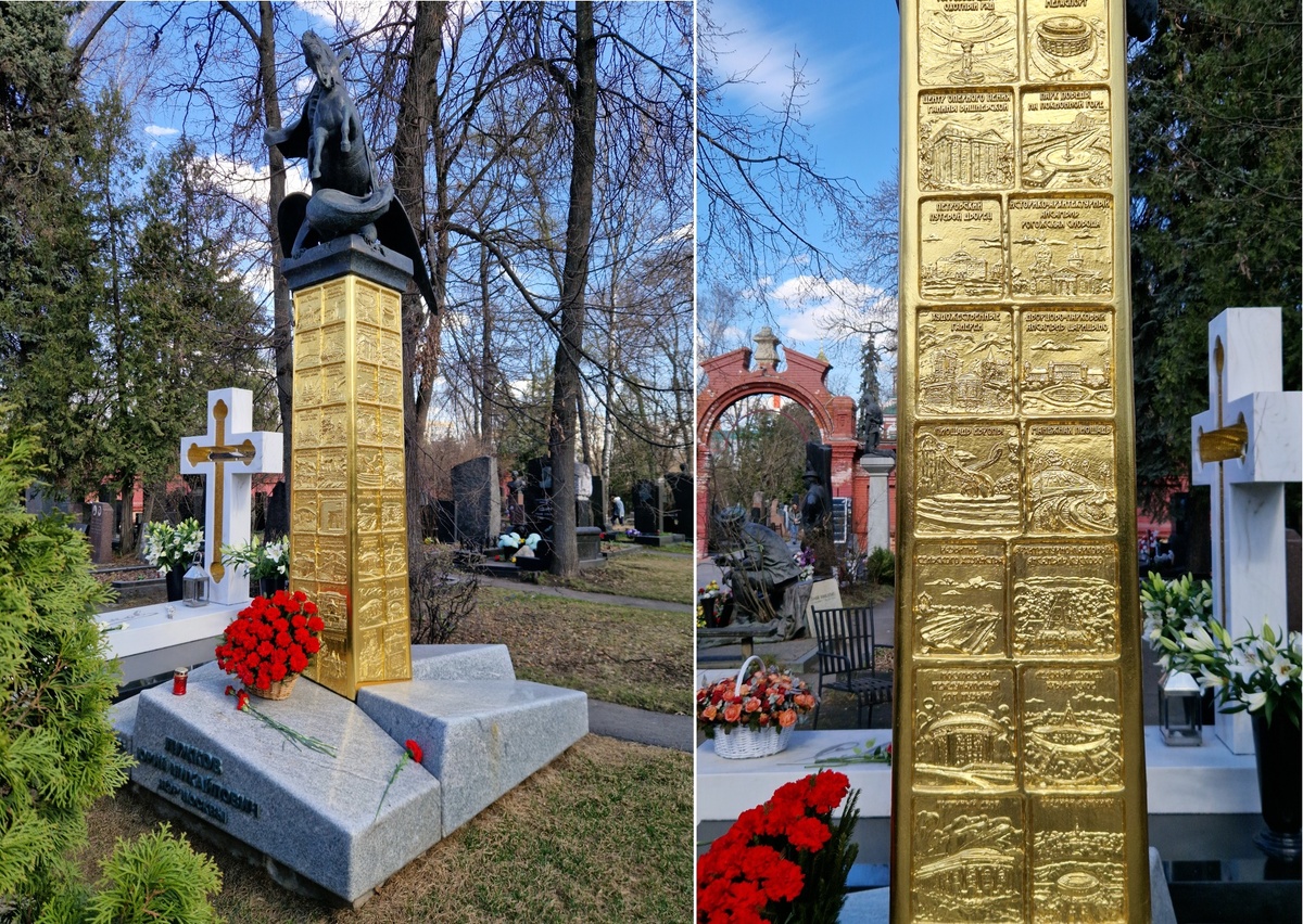 Были сегодня на Новодевичьем кладбище — зашли навестить прах близкого человека. И решили немного там прогуляться. Это кладбище как музей. Там если видишь фамилию на памятнике и думаешь: «Тот самый?» — то это и правда будет тот самый. Туда ведь и экскурсии водят. Но мы как-то раньше там не гуляли. Прошлись по аллеям, повстречались с могилами многих тех самых (удивительно, но на этом кладбище чрезвычайно мало оградок, что для российских погостов необычно). И видим вдруг сияющий квадратный столб. Сразу поняли: кто-то лежит под ним непростой. Оказалось, это могила Юрия Михайловича Лужкова. Из геометрических глыб серого гранита вырастает золотая колонна с табличками-клеймами, на которых отражены заслуги бывшего мэра Москвы, а венчает это всё поражающий змея Георгий Победоносец. Я сразу поразился, как точно воспроизводит этот памятник лужковскую эпоху с её бескрайней любовью к эффектным, броским, безвкусным и дорогим проектам. Даже скульптура наверху сразу напоминает о бестолковой, спот