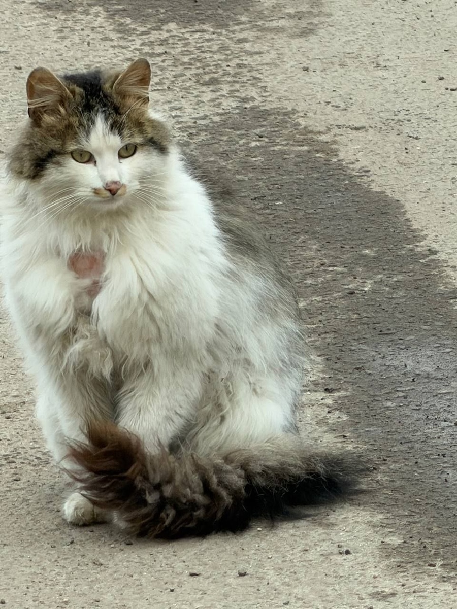 Добрый день! Вот такой котик (или кошка) пропадает на улице 😭 на груди не понятно что , то ли рана , то ли шишка
