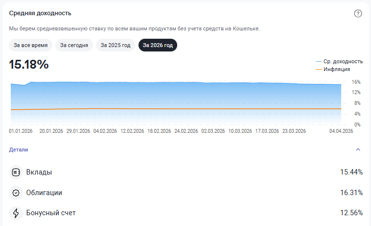 В марте продолжали инвестирование в депозиты через маркетплейс ФинУслуги. Доходность по депозитам с начала года составляет 15,44%. Мартовское снижение ключевой ставки до 15% снизило и ставки депозитов на маркетплейсе, сейчас 14,2% на 3-х и 14,5% на 6-ти месячные депозиты. Структура депозитов по банкам: В общем объеме инвестиций через ФинУслуги депозиты составляют 84%. Инвестиции в народные облигации Черкизово, ЕвроТРанс и МТС: Облигации Томской области были в марте погашены, а жалко, там годовой купонный доход составлял 23% (20,01% за вычетом НДФЛ). В марте депозит на брокерском счете рос только за счет зачисления на брокерский счет купонного дохода, который инвестировали в облигации. Доход (за вычетом НДФЛ) к марту составил 3,78%, из них купонный доход 3,64% остальное дивиденды и чуть доход от продажи акций. В марте продолжали докупать облигации за счет выплаченного купонного дохода. Годовая доходность портфеля облигаций в марте составила 16,11% (за вычетом НДФЛ), в портфеле облигации