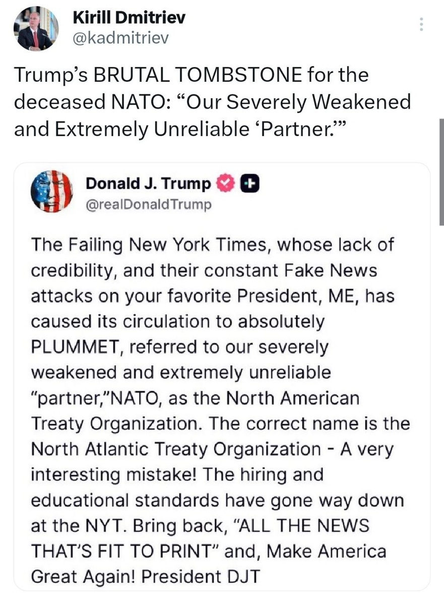 'Trump’s BRUTAL TOMBSTONE for DECEASED NATO' — Dmitriev