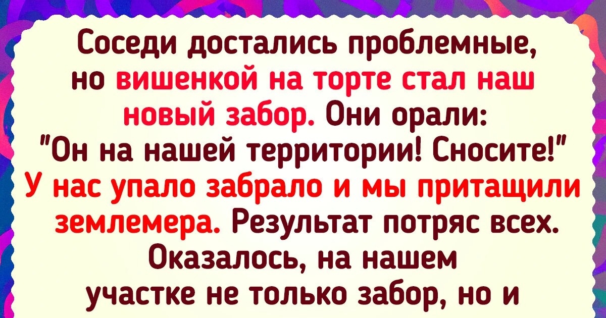 Соседи достались проблемные, но вишенкой на торте стал наш новый забор. Они орали: «Он на нашей территории! Сносите!» У нас упало забрало и мы притащили землемера. Результат потряс всех. Оказалось, на нашем участке не только забор, но и ее оградка, кусты смородины. Мало того, что полосу размежевания захапала, так еще и два метра нашего участка! Позвонили бывшим хозяевам. Те сказали, что видели, как заборчик соседей вместе с кустами ягод постепенно перемещался на их участок, но с этой скандалисткой связываться себе дороже. Перенесли забор на законное место. Соседка орала, что у нее элитные кусты, и требовала вернуть. Муж сказал, что это плата за пользование нашей землей. Начала гадости на воротах писать. Вызвали полицию. Ребята попались понимающие, еще и с юмором. Начали стращать и протокол писать. Сдалась! Продали они дачу. Теперь у нас новые соседи. Не знаю, какие. После этих ни с кем знакомиться не хотим. © Царевна Будур / Dzen