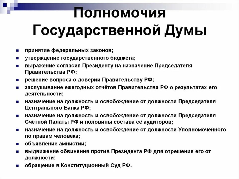 3. Председатель Правительства представляет Государственной Думе на утверждение кандидатуры вице-премьеров и министров (за исключением министров силового блока и МИД, назначаемых Президентом единолично). Государственная Дума рассматривает представленные кандидатуры и принимает решение об их утверждении.