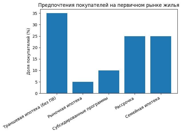 Траншевую ипотеку без первоначального взноса выбирают 35% покупателей на первичном рынке столицы. Рыночную ипотеку из-за дороговизны рассматривают не более 5% клиентов. Субсидированные застройщиками программы с минимальным первоначальным взносом интересуют 10%