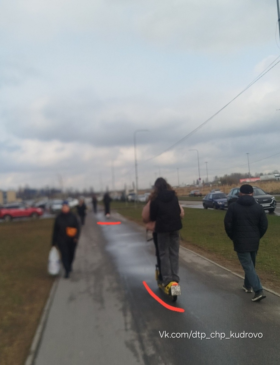 Проведите беседу со своими детьми что вдвоëм на самокате ездить ЗАПРЕЩЕНО. Также что нельзя гонять рядом с пешим человеком и в придурь ему сигналить в спину, в таких случаях нужно СПЕШИВАТЬСЯ. На данном фото четыре малолетние дуры, которые гоняют попарно. ДТП и ЧП Кудрово