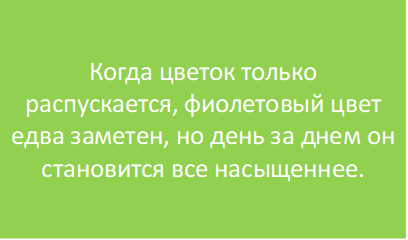 Очень интересно в этом сорте — это игра цвета. Лепестки на концах имеют нежный фиолетовый оттенок. К основанию они становятся белоснежными. Когда цветок только распускается, фиолетовый цвет едва заметен, но день за днем он становится все насыщеннее.