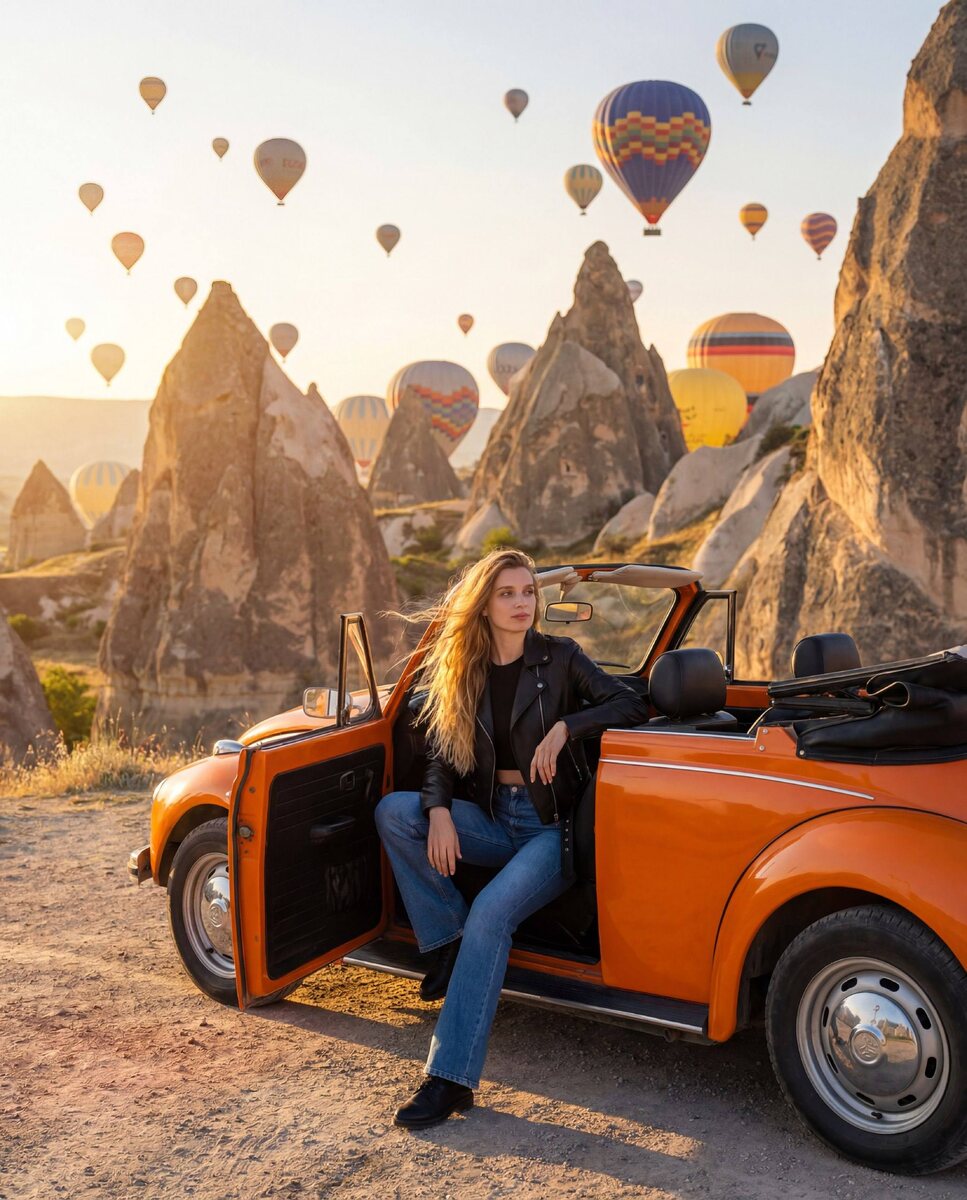 Чтобы сгенерировать такое же достаточно взять мой промт и свое фото и второе фото Капподокии ⬇️ Я делала в Syntx Al Вот промт: I will upload two images: Image 1 — a photo of a person. Image 2 — a reference photo of Cappadocia landscape. Use Image 1 as the face and body reference, preserving the person’s facial features and natural proportions. Use Image 2 as the environment reference, recreating the authentic Cappadocia scenery. Create a cinematic fashion photoshoot scene in Cappadocia, Turkey. Location: Göreme / Love Valley, Cappadocia. Scene: A bright yellow or vibrant orange vintage convertible car is parked on a scenic road in the middle of the Cappadocia valley. The car is completely stationary. The person is sitting casually on the car (on the door or hood) in a relaxed pose. Hair moves slightly in a gentle breeze. Outfit: • black leather jacket • black crop top • blue flared jeans • black boots Body type: • slim and lean build • naturally slender silhouette • reduced