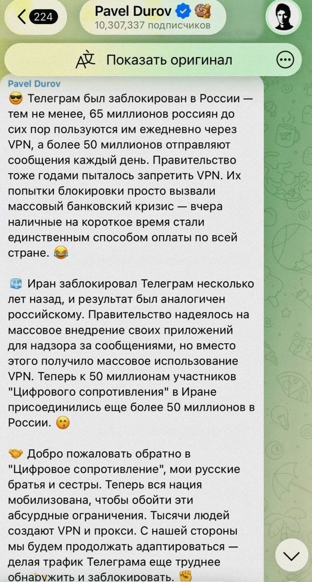 ‼️ ПАВЕЛ ДУРОВ ВЫСТУПИЛ ПРОТИВ БЛОКИРОВОК TELEGRAM В РОССИИ! Создатель Telegram впервые открыто прокомментировал ограничения работы мессенджера на территории России. По его словам, такие меры не дадут желаемого результата, потому что полностью заблокировать VPN и прокси невозможно. В своём обращении он заявил, что Telegram продолжит адаптироваться к новым ограничениям и усложнять обнаружение своего трафика. «Добро пожаловать обратно в “Цифровое сопротивление”, мои русские братья и сёстры. Теперь вся нация мобилизована, чтобы обойти эти абсурдные ограничения. Тысячи людей создают VPN и прокси. С нашей стороны мы будем продолжать адаптироваться, делая трафик Telegram ещё труднее обнаружить и заблокировать» ❤️🔥 — МЫ ПРОТИВ БЛОКИРОВОК! 💀 FML MATTERS