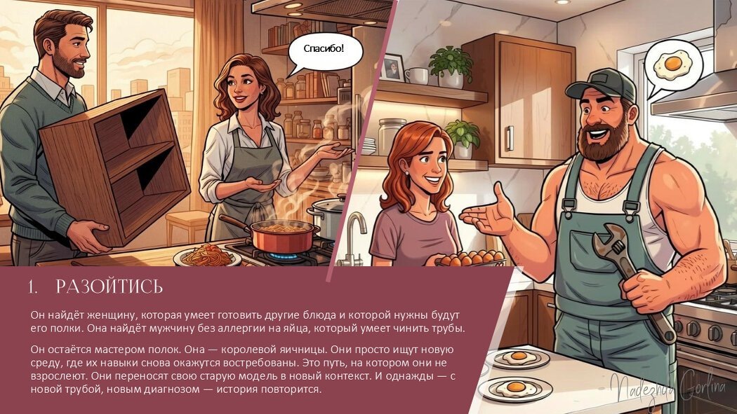 Понять, что кризис — это естественный этап развития. Если пара не проходит через такие этапы, она не взрослеет. Она застревает на уровне «яичницы и полок». И тогда любое изменение становится для неё фатальным.