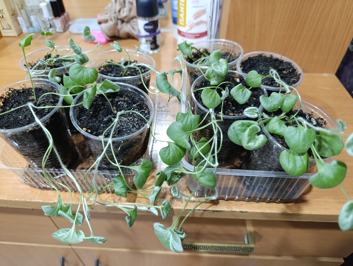 Поэтому я решила высадить дихондру в горшки, в которых буду выращивать, и разместить эти горшки в теплом тоннеле на улице.