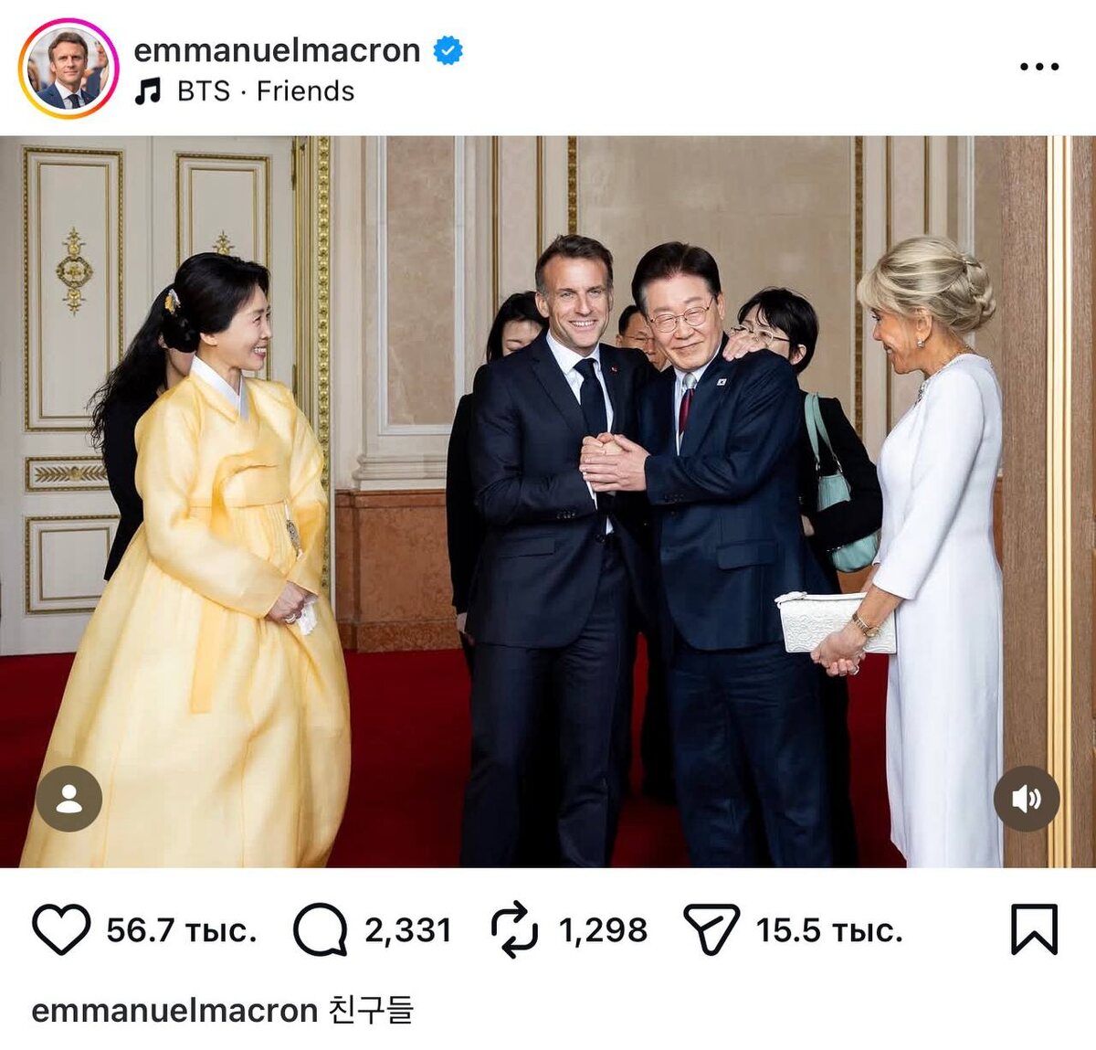 🍊 Президент Франции Эммануэль Макрон использовал песню "Friends" в качестве музыкального сопровождения в посте с президентом Южной Кореи Ли