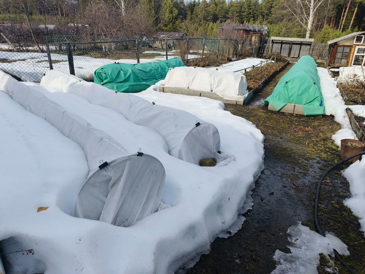 Всем добрый день! У нас несколько дней стоит замечательная погода. Тепло как летом, днём до +20, ночью 0+5. Снег интенсивно тает. А возможности сбегать в сад нет. Я вся измаялась, думала как там мои розы, поди сопрели все под зимними шубами 🤣. Когда в укрытии резко поднимается температура, инфекционный ожог гарантирован. Пришла открывать розы на проветривание, а там ещё пол участка в снегу. На северном склоне снега по колено.