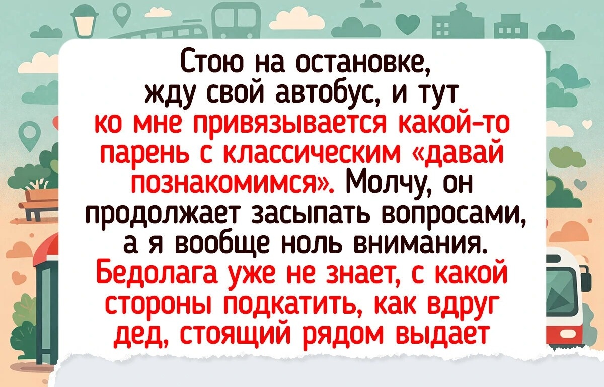 Стою я как-то на остановке, жду свой автобус, и тут ко мне привязывается какой-то парень с классическим «давай познакомимся». Я молчу, он продолжает засыпать вопросами, а я вообще ноль внимания. Бедолага уже не знает, с какой стороны подкатить и чем растопить мое ледяное сердце, как вдруг дед, стоящий рядом и наблюдавший за всей этой драмой, выдает: «Да не майся ты, может, она глухая!» И тут я, конечно, не выдержала и как давай ржать на всю остановку! © ADME