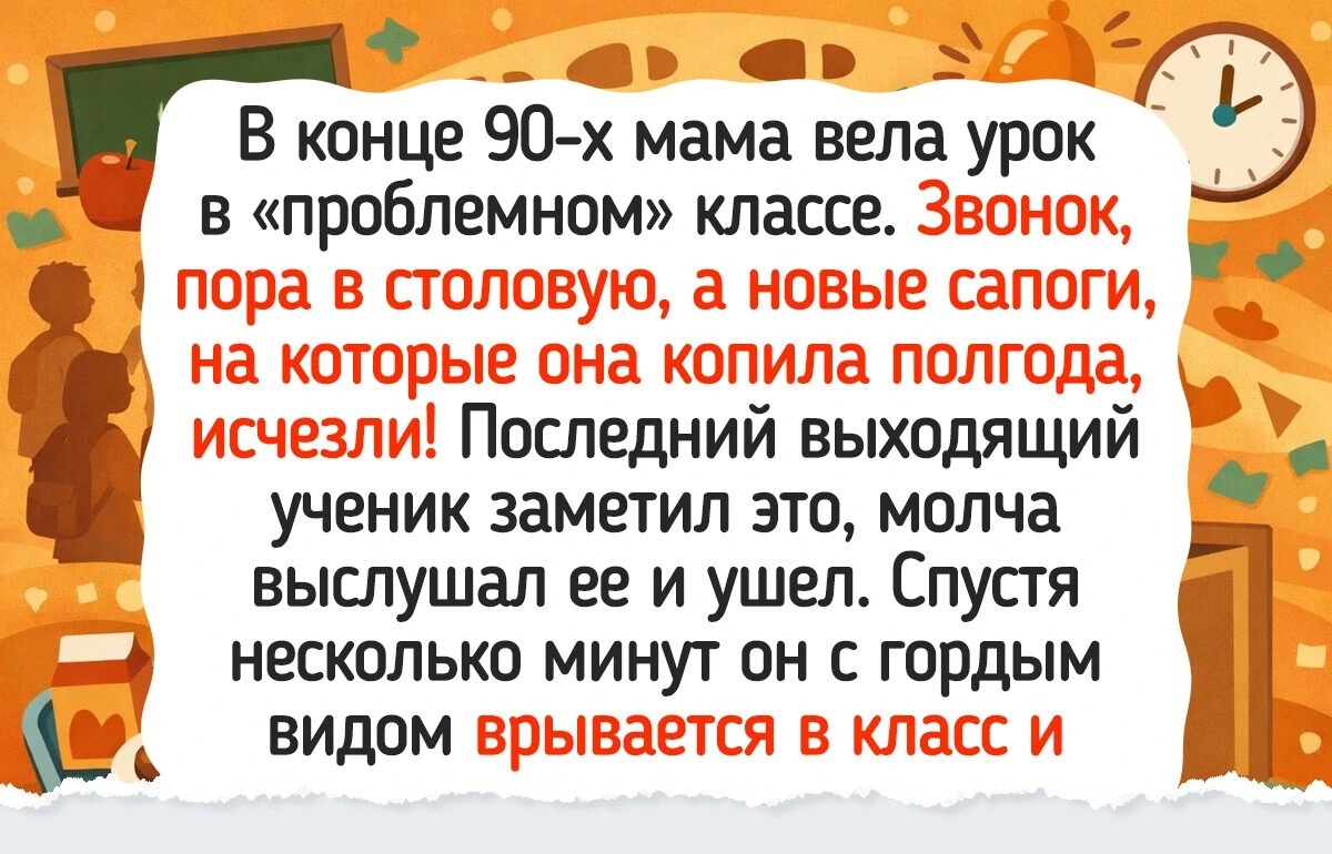 Мама была учителем строгим, но справедливым. Строгой настолько, что в школьном туалете ее узнавали по цоканью каблуков. Конец 90-х. Я сижу на последнем ряду, рисую. Мама ведет урок у «проблемного» класса. Урок заканчивается. Мама собирается вести меня в столовую и вдруг обнаруживает: сапог-то нет. Тех самых, новых зимних сапог, на которые долго копили. Это замечает последний выходящий ученик. Разобравшись в ситуации, он молча уходит. Звенит звонок на следующий урок — и вдруг с победоносным видом заходит тот самый ученик и протягивает маме пакет с ее сапогами. Как выяснилось, он быстро понял, кто, куда и зачем их унес. Сбегал, разобрался и вернул пропажу. Почему вернул? Сказал просто: «Нельзя любимого учителя так подводить». © shushaniada / Pikabu
