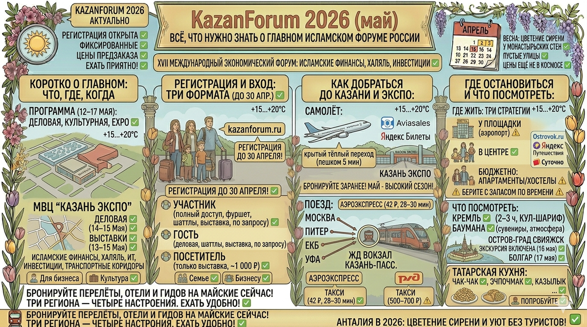 С 12 по 17 мая в Казани пройдёт главный экономический форум России и исламского мира — KazanForum 2026. Это уже XVII форум, и с каждым годом он становится крупнее: в 2025-м приехали участники из 96 стран, подписали 130 соглашений. В 2026-м ожидают ещё больше. Если вы едете — как деловой человек или просто посмотреть — ниже всё практическое: как купить билеты, где остановиться, как добраться до площадки и сколько на это потратить. XVII Международный экономический форум «Россия — Исламский мир: KazanForum» Тематика форума — исламские финансы, халяль-индустрия, инвестиции, IT, медицина, строительство, транспортные коридоры, промышленное партнёрство. Плюс культурная программа, модный показ, экскурсии по ЮНЕСКО. Регистрация открыта до 30 апреля 2026 на сайте reg.kazanforum.ru Форматов три: Участник — полный доступ: деловая и культурная программа, фуршет, шаттлы, выставка. Оформляется через оргкомитет, стоимость по запросу. Гость — отдельные сессии деловой программы (кроме закрытых), шаттлы,