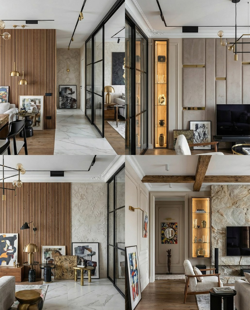 Это, пожалуй, одна из самых частых ошибок в интерьере. Люди смотрят красивые картинки, сохраняют десятки референсов, видят один эффектный прием, потом второй, потом третий, и в какой-то момент решают: а почему бы не взять всё лучшее сразу? Так в одной квартире появляются рейки, декоративная штукатурка, крупный керамогранит, стеклянные перегородки, латунь, черные акценты, сложный свет, мягкие панели, витрины, подсветка, молдинги, дерево, камень и еще несколько “интересных деталей” на сдачу.