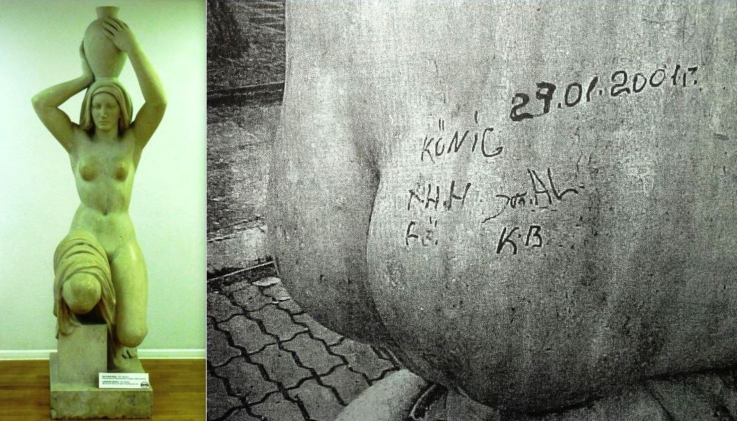 Калининградский Светлогорск – бывший прусский Раушен. И среди прочего в наследство ему досталась «Несущая воду» (в народе – девушка с кувшином). Прекрасная и, пожалуй, самая известная работа Германа Брахерта: Много лет она стояла в Лиственничном парке Светлогорска. Однако со временем от пребывания на улице скульптура начала разрушаться. Кроме того, чем дальше, тем чаще к ней стали тянуться вандалы. Так, весной 1991-го над «Несущей воду» поглумились, измазав её чёрной и синей тушью, пастой из шариковых ручек, жирными карандашами. С трудом смыв художества (причём, как утверждалось, попутно причинив мрамору повреждения), уже тогда грозились убрать её в безопасное место, а в парке установить копию. Но «святые 90-е» – не лучшее время для подобных проектов. Так что мраморная девушка продолжала стоять там, где стояла. И по-прежнему притягивала к себе вандалов. В начале 2001 года она подверглась очередной массированной атаке. Вновь пошли разговоры о том, что её необходимо спасать. Однако в это