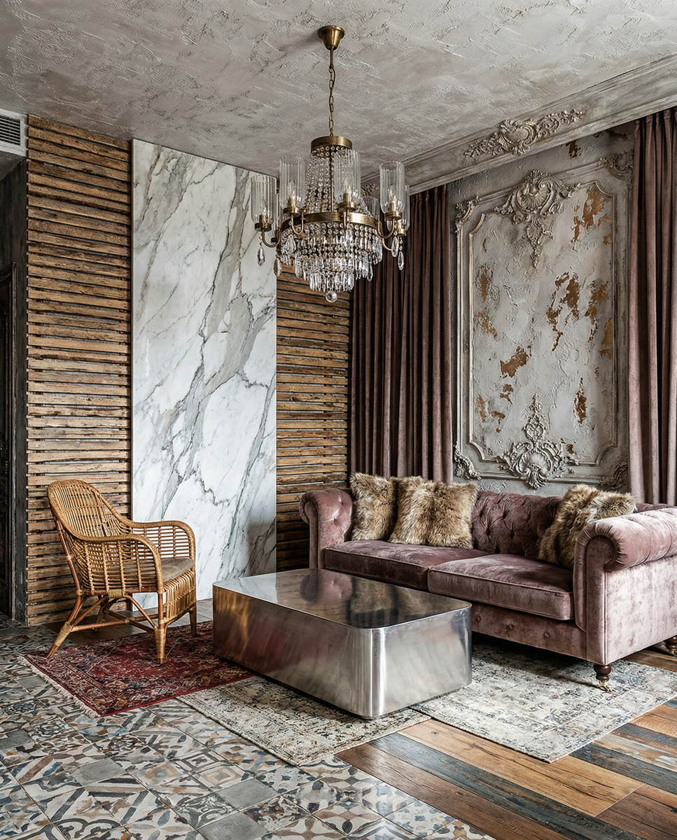 Когда в одной комнате собирают дерево, мрамор, металл, рейки, декоративную штукатурку и ещё пару акцентов сверху, интерьер начинает спорить сам с собой. Вместо ощущения статуса появляется ощущение перегруза.