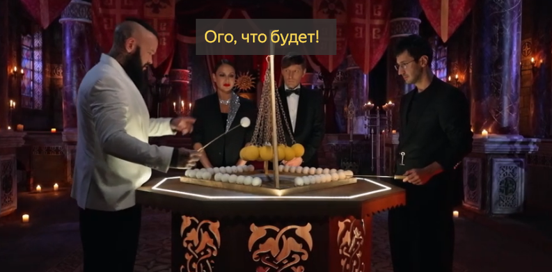 Тонкой спицей поддеть шар и положить на другие шары. Долго кладут шары, но чем дальше, тем труднее найти место для своего шара. Коуч положил свой шар и вся шаровая конструкция красиво падает 1 : 0 в пользу Магомеда.