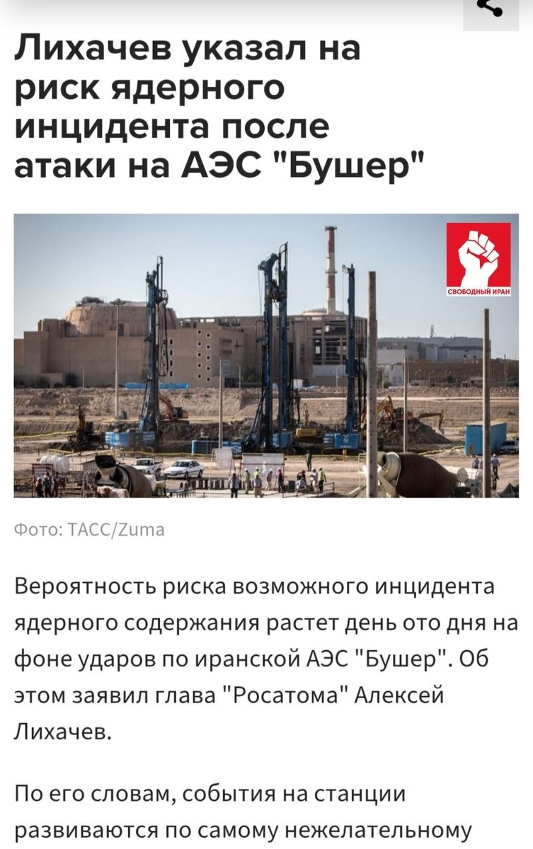 Глава Росатома Лихачев сообщил, что после удара по иранской АЭС Бушер началась эвакуация 198 российских специалистов. По его словам, они должны безопасно пройти маршрут через почти весь Иран за 2,5–3 суток.