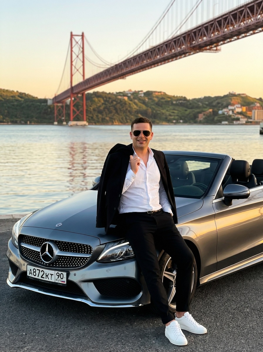 🤖Генерировать можно здесь: 👉БОТ ДЛЯ ГЕНЕРАЦИИ Режим Nano Banana Pro/2 ИНСТРУКЦИЯ Молодой мужчина с загруженного фото, коротко стриженные тёмные волосы, уверенный спокойный взгляд через солнцезащитные очки-авиаторы. Эмоция — расслабленная уверенность, лёгкая улыбка, ощущение успеха и свободы. Одежда: белая рубашка с расстёгнутым воротником, чёрные брюки классического кроя, белые кроссовки премиум-класса, чёрный пиджак небрежно переброшен через плечо. Стиль одежды — smart casual luxury. Фон: знаменитый мост 25 апреля в Лиссабоне (Португалия), виден целиком на заднем плане, над водой реки Тежу. Вода спокойная, отражает небо. На дальнем берегу — зелёные холмы с домами. Автомобиль — современный серый Mercedes-Benz C-Class Cabriolet (или похожий люксовый кабриолет), стоит на каменной набережной, крутые российские номера. Мужчина сидит на переднем крыле авто, одна нога согнута, другая вытянута. Свет: мягкий золотой час, закатное солнце слева от камеры, создаёт тёплые блики на машине и кож