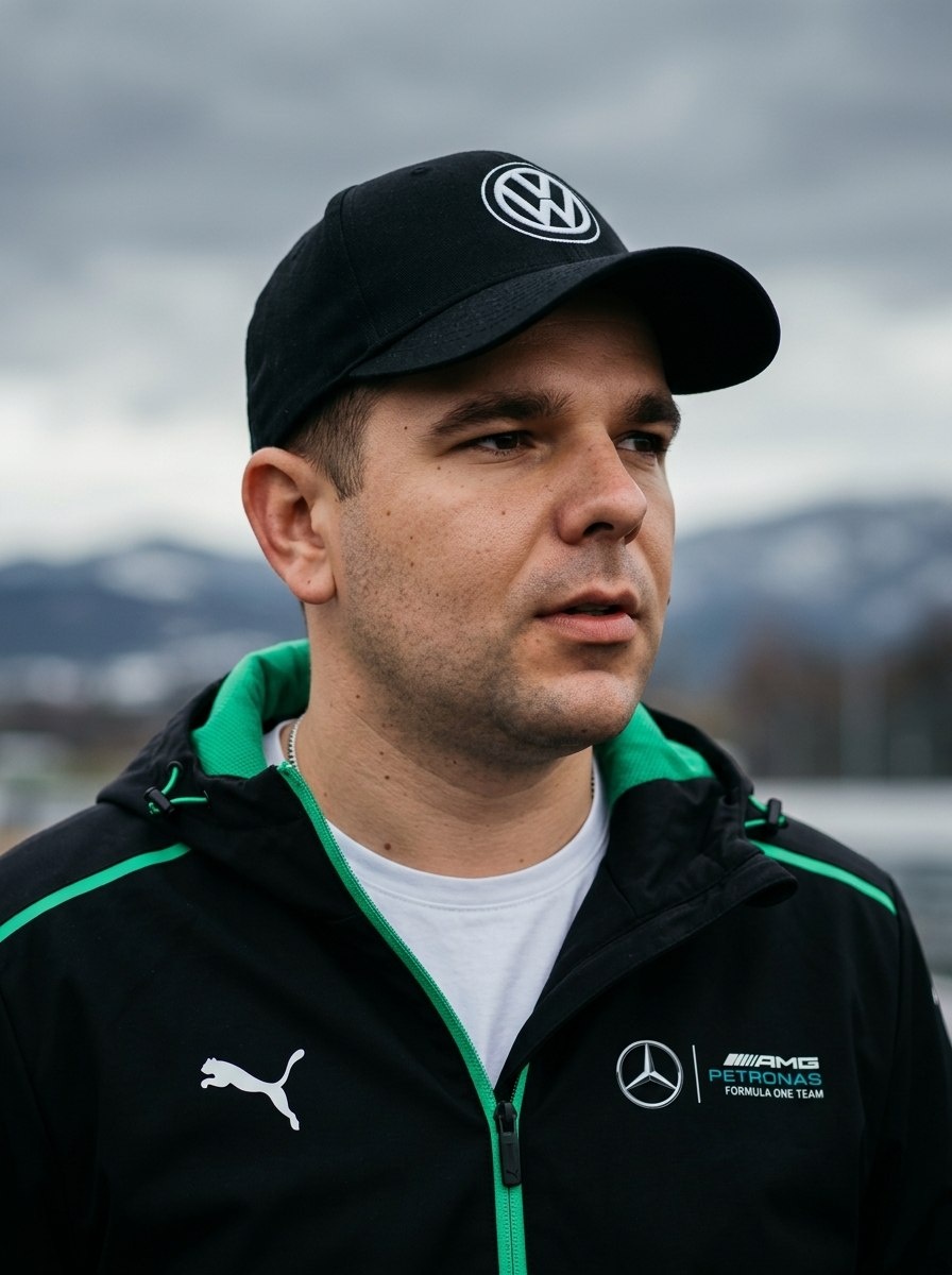 🤖Генерировать можно здесь: 👉БОТ ДЛЯ ГЕНЕРАЦИИ Режим Nano Banana Pro/2 ИНСТРУКЦИЯ Портрет молодого мужчины с загруженного фото, коротко стриженные темныее волосы под чёрной бейсболкой с белым логотипом Volkswagen на передней части. Лицо выражает сосредоточенность и лёгкую задумчивость — взгляд направлен вправо от камеры, губы слегка приоткрыты, как будто он только что закончил говорить или прислушивается к чему-то важному. Кожа естественная. Одет в спортивную куртку чёрного цвета с ярко-зелёными контрастными полосами по краям капюшона и молнии, на левой стороне груди — белый логотип Puma, на правой — эмблема Mercedes AMG Petronas Formula One Team. Под курткой — простая белая футболка с круглым вырезом. Стиль одежды — функциональный, спортивный, профессиональный, ассоциируется с автоспортом или техническим персоналом гоночной команды. Фон — размытый пейзаж с серыми облаками и силуэтами гор или холмов на заднем плане, создающий атмосферу холодной погоды или раннего утра/вечера. Освещени