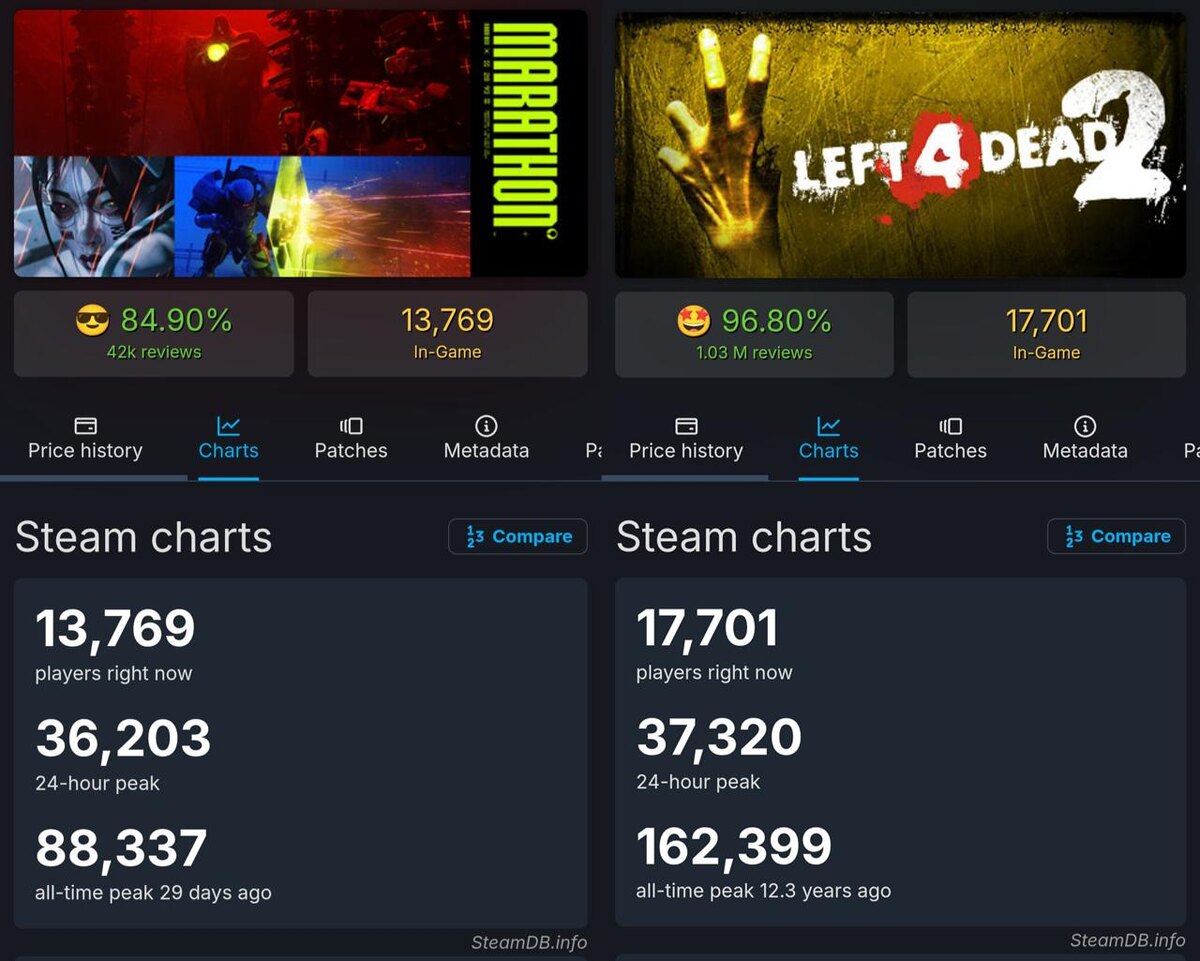 Игроков в Left 4 Dead 2 стало больше, чем в Marathon от Sony. Релиз Marathon состоялся менее месяца назад. Left 4 Dead 2 летом исполнится 17 лет. https://dzen.ru/id/5c0e38ff46ef5c00aaa80527