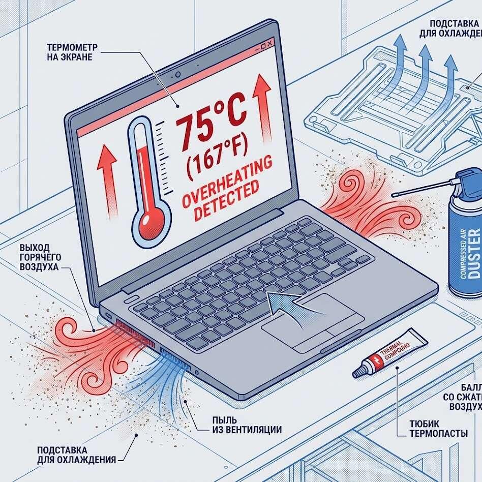 Ноутбук греется сильнее обычного, вентилятор шумит как турбина, а в играх он выключается сам по себе? Это не "особенность модели", а сигнал проблемы. Игнорировать перегрев нельзя - высокие температуры сокращают срок службы процессора и видеокарты, а в худшем случае могут привести к отказу материнской платы. Вот три главные причины перегрева и что можно сделать без визита в сервисный центр. Вентиляторы ноутбука постоянно затягивают воздух вместе с пылью, шерстью и мелкими частицами. Со временем пыль намертво забивает радиатор и вентиляционные решётки. Горячий воздух не может выйти наружу, компоненты работают на пределе. Как исправить: Продуйте систему охлаждения баллоном со сжатым воздухом. Выключите ноутбук, отключите питание и задуйте струю в вентиляционные отверстия короткими импульсами. Не используйте пылесос - он может повредить хрупкие детали. Если продувка не помогла, значит, пыль спеклась в плотный войлок. В этом случае нужна полная разборка и чистка - делайте её в сервисе раз