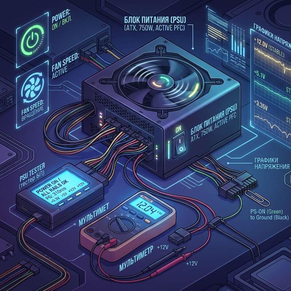 Компьютер не подаёт признаков жизни? Возможно, проблема в блоке питания. Но как это проверить, не подключая его к материнской плате? Есть несколько простых способов. Диагностика всегда начинается с осмотра. Отключите БП от сети, извлеките его из корпуса и снимите крышку. На что обратить внимание: Если нашли что-то подозрительное - блок питания пора менять. Этот тест проверяет, включается ли блок питания в принципе. Для замыкания вам понадобится обычная канцелярская скрепка. Как выполнить: Если БП исправен: вентилятор внутри начнёт вращаться. Если вентилятор не крутится или блок щёлкает - он неисправен. Этот способ покажет, все ли напряжения соответствуют норме. Как выполнить: Допустимые отклонения: значения на линиях +12 В, +5 В и +3.3 В не должны отличаться от номинала более чем на ±5%. Это самый простой и безопасный вариант для быстрой диагностики. Как выполнить: Подписывайтесь на канал, чтобы не пропускать новые инструкции по диагностике и ремонту ПК. #блокпитания #PSU #диагностика