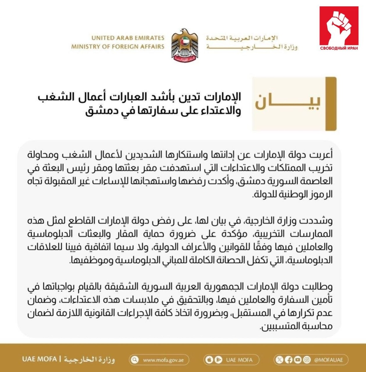 🚨 У дипмиссии ОАЭ в сирийской столице прошла акция протеста: часть демонстрантов пыталась прорваться внутрь. Причиной назвали возмущение тем, что здание считают произраильским посольством, а также законом о смертной казни террористов в 🇮🇱 Израиле. МИД ОАЭ осудил нападение и потребовал от сирийских властей защитить дипломатические объекты и не допустить повторения инцидента. Подпишитесь на канал