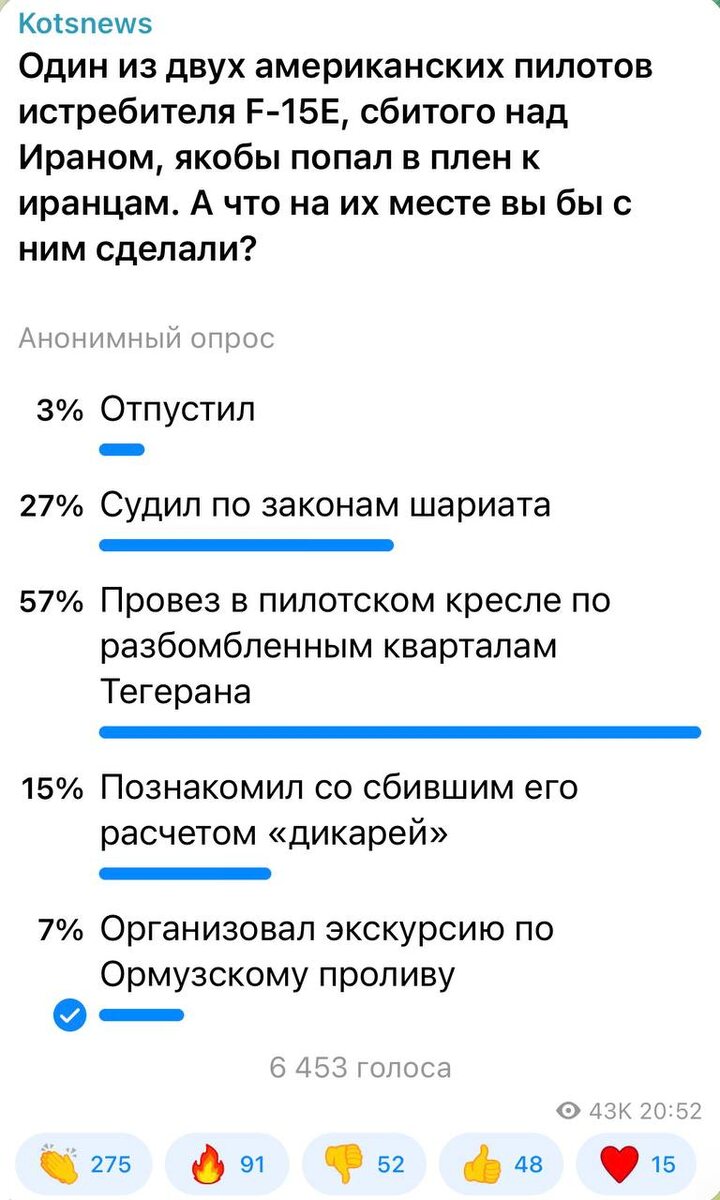 ⚡️⚡️⚡️ 57 процентов подписчиков считают, что сбитому летчику неплохо было бы устроить экскурсию по разваленным кварталам Тегерана