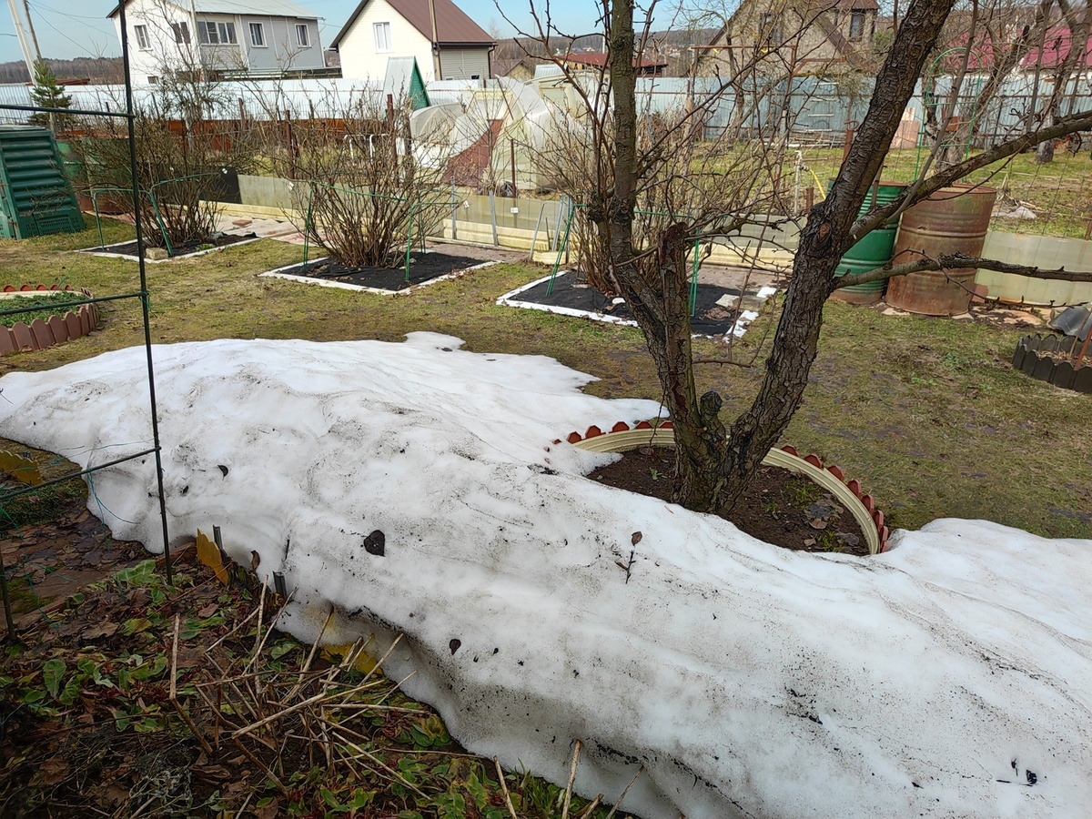 4 апреля 2026 года Ну вот я и добралась до любимой дачи. Обычно мы сразу после возвращения с зимовки едем на несколько дней на дачу, чтобы посмотреть, как она перезимовала без нас. В этом году зима была очень снежная, и мы не стали спешить, потому что совсем не хотели брать в руки лопаты и кидать снег. Мы просто дождались, когда он сам растает. Зачем делать лишнюю работу? Мы прекрасно и с пользой провели время в городе. А вчера утром собрались и отправились на дачу. По дороге удивило то, что даже в лесу уже нет снега, совсем нет. А на нашем участке сохранился целый сугроб, единственный. Он получился от снега, сползавшего с крыши. Ох уж этот снег, наделал бед. Поломал нам несколько пластиковых желобов, идущих вдоль крыши. По ним дождевая вода собиралась в бочки. Иногда мы эти желоба на зиму снимали, но в эту зиму оставили. И прогадали. Снега-то было очень много, вот и не выдержали желоба. Будет нам наука на будущее, надо снимать. Тепличка наша жива, стоит! Потому что сыновья несколь
