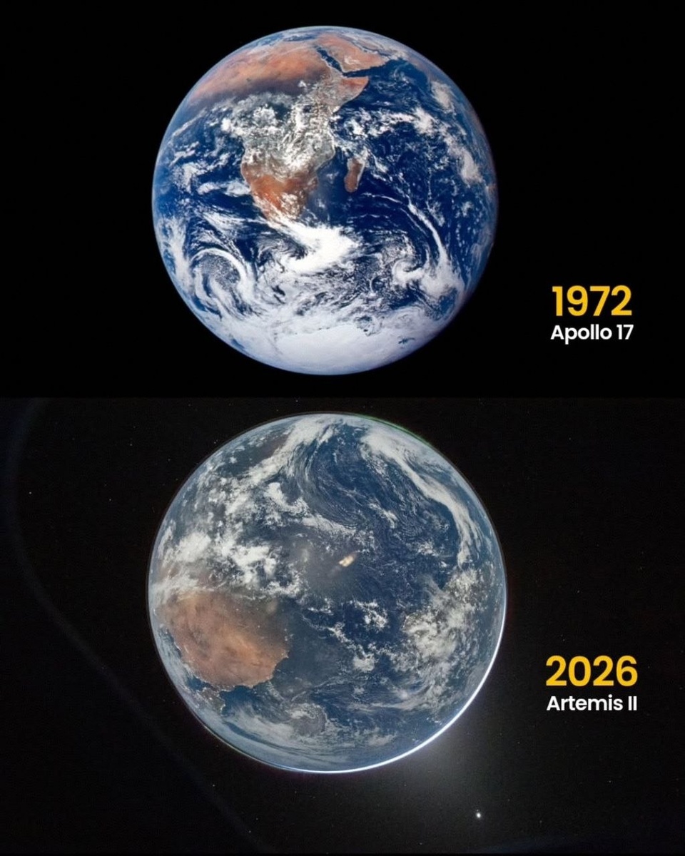 Одна планета. Слева — Земля глазами экипажа «Аполлон-17», 1972 год. Справа — 2 апреля 2026, снято экипажем «Артемида II» из иллюминатора «Ориона». Видно зелёное свечение атмосферы, огни городов на ночной стороне и терминатор — линию между днём и ночью. Технологии ушли на полвека вперёд, а планета всё та же — красивая и хрупкая.