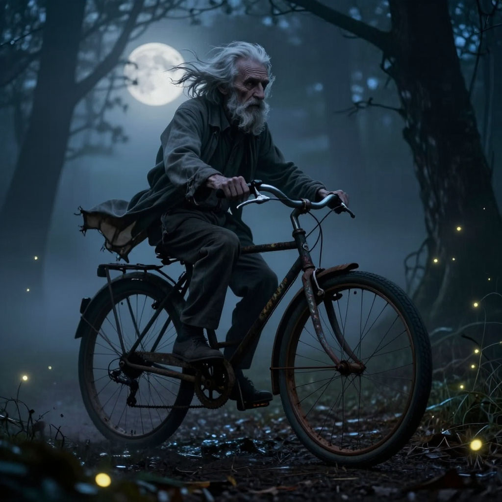 Лиза уехала тем же днём. Но где бы она ни была теперь, раз в несколько месяцев, ровно в полночь, она слышит за окном тихий скрип колёс и чувствует, как по спине пробегает холодок. А иногда ей снится один и тот же сон: она открывает дверь, садится на ржавый велосипед позади старика, и они взмывают в небо, уносясь прочь от земли, туда, где время течёт по‑другому…