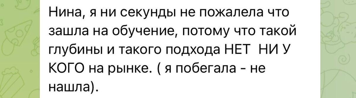 «Нина, я ни секунды не пожалела что зашла к тебе в работу, потому что такой глубины и такого подхода НЕТ НИ У КОГО на рынке. ( я побегала - не нашла)»